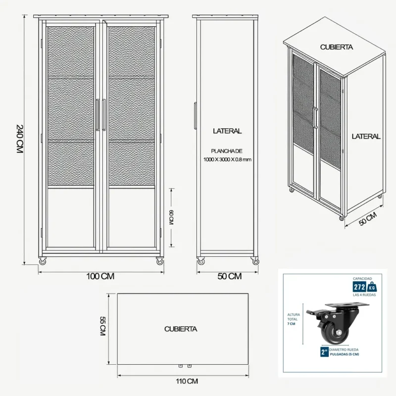 Gracias a sus dimensiones de 240 cm de alto x 100 cm de ancho x 50 cm de fondo, ofrece una gran capacidad de almacenaje sin ocupar demasiado espacio en tu hogar o negocio. Además, su estructura metálica está diseñada para soportar peso y uso intensivo, garantizando resistencia, estabilidad y una larga vida útil.