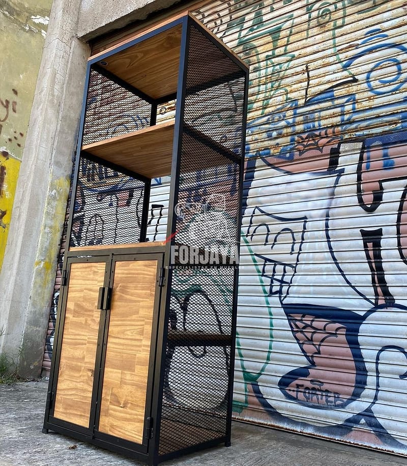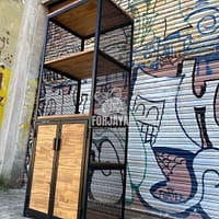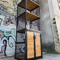 - Cubierta y estantes de madera: pino, lenga o roble sellados con barniz protector para conservar la veta y resistir líquidos.